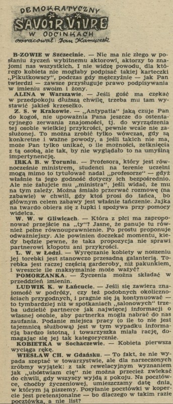 Archiwum / Demokratyczny savoir-vivre nr 267 (21/1950) 8372/123969 Podziel się Tytuł Demokratyczny savoir-vivre Autor Jan Kamyczek Rubryka Demokratyczny savoir-vivre Artykuł z numeru 267 (21/1950) Data wydania 21 maja 1950