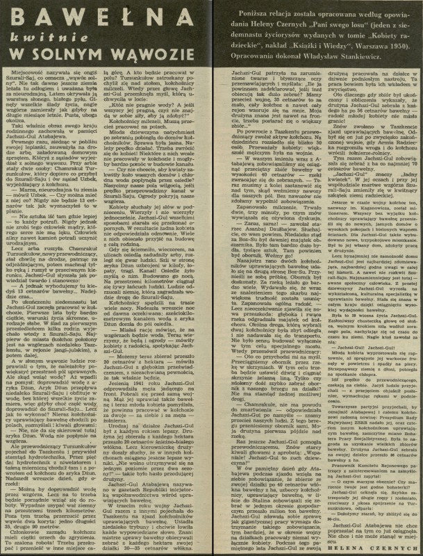 Archiwum / Relacja nr 295 (49/1950) 9419/123969 Podziel się Tytuł Bawełna kwitnie w solnym wąwozie Autor Helena Czernych Kategoria Relacja Artykuł z numeru 295 (49/1950) Data wydania 3 grudnia 1950 Tagi Uzbekistan Helena Czernych Szurali-Saj