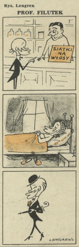 Archiwum / Profesor Filutek nr 276 (30/1950) 2/3 Podziel się Tytuł Prof. Filutek Autor Zbigniew Lengren Rubryka Profesor Filutek Artykuł z numeru 276 (30/1950) Data wydania 23 lipca 1950 Tagi żart rysunkowy siatka na włosy