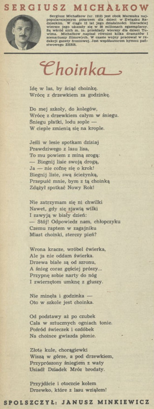 Archiwum / Poezja nr 246 (52/1949) 57/57 Podziel się Tytuł Choinka Autor Sergiusz Michałkow Janusz Minkiewicz Kategoria Poezja Artykuł z numeru 246 (52/1949) Data wydania 24 grudnia 1949 Tagi wiersz