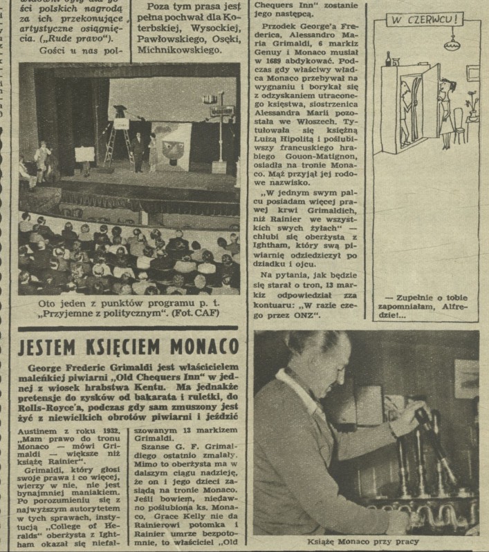 Archiwum / Artykuł nr 585 (26/1956) 08/10 Podziel się Tytuł Jestem księciem Monaco Kategoria Artykuł Artykuł z numeru 585 (26/1956) Data wydania 24 czerwca 1956 Tagi Monako Grimaldi
