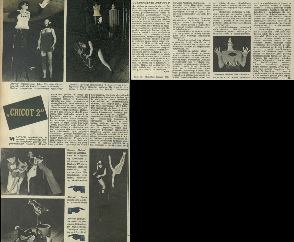 Archiwum / Teatr nr 582 (23/1956) 17/34 Podziel się Tytuł „Cricot 2” Autor Kydr. Bł. Rubryka Teatr Artykuł z numeru 582 (23/1956) Data wydania 3 czerwca 1956 Tagi "Mątwa" Mikulski "Dom Plastyków Witkacy