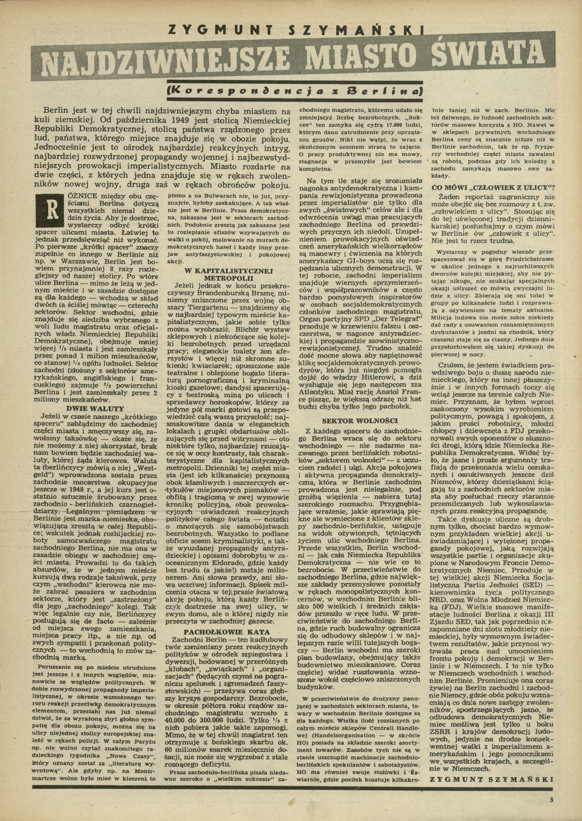 Archiwum / korespondencja własna "Przekroju" nr 281 (35/1950) 8897/123969 Podziel się Tytuł Najdziwniejsze miasto świata (korespondencja z Berlina) Autor Zygmunt Szymański Rubryka korespondencja własna "Przekroju" Artykuł z numeru 281 (35/1950) Data wydania 27 sierpnia 1950