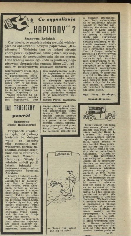 Archiwum / Listy do i od redakcji nr 587 (28/1956) 46/73 Podziel się Tytuł Listy do i od redakcji Rubryka Listy do i od redakcji Artykuł z numeru 587 (28/1956) Data wydania 8 lipca 1956 Tagi papierosy "Kapitany" Paul Abraham