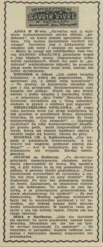 Archiwum / Demokratyczny savoir-vivre nr 588 (29/1956) 330/493 Podziel się Tytuł Demokratyczny savoir-vivre Autor Jan Kamyczek Rubryka Demokratyczny savoir-vivre Artykuł z numeru 588 (29/1956) Data wydania 15 lipca 1956 Tagi obyczaje kultura