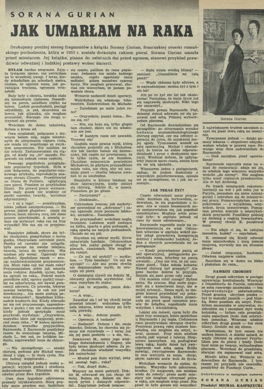 Archiwum / Proza nr 590 (31/1956) 29/42 Podziel się Tytuł Jak umarłam na raka Autor Sorana Gurian Michał Kasprzycki Kategoria Proza Artykuł z numeru 590 (31/1956) Data wydania 29 lipca 1956 Tagi literatura francuska fragment książki rak piersi