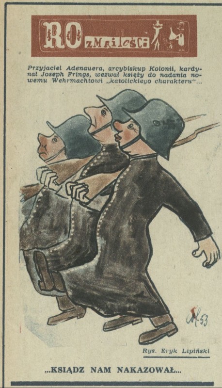 Archiwum / Rozmaitości [old] nr 418 (15/1953) 14826/123969 Podziel się Tytuł Ksiądz nam nakazywał... Autor Eryk Lipiński Rubryka Rozmaitości [old] Artykuł z numeru 418 (15/1953) Data wydania 7 kwietnia 1953 Tagi Adenauer Wehrmacht polityka karykatura satyra