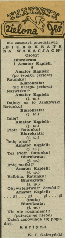 Archiwum / Teatrzyk Zielona Gęś nr 284 (38/1950) 15/45 Podziel się Tytuł Biurokrata na wakacjach Autor Konstanty Ildefons Gałczyński Rubryka Teatrzyk Zielona Gęś Artykuł z numeru 284 (38/1950) Data wydania 17 września 1950 Tagi groteska humor scenka rodzajowa gag