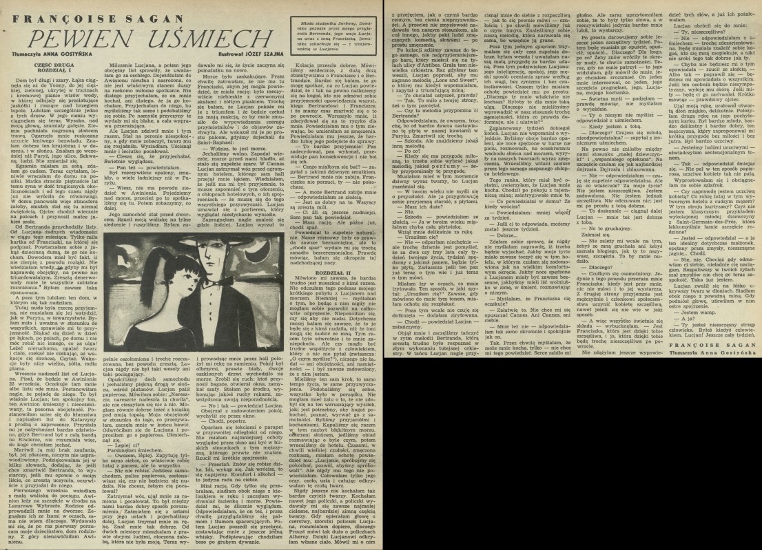 Archiwum / Proza nr 595 (36/1956) 35/42 Podziel się Tytuł Pewien uśmiech Autor Franciose Sagan Anna Gostyńska Kategoria Proza Artykuł z numeru 595 (36/1956) Data wydania 2 września 1956 Tagi fragmenty powieści romans literatura francuska Szajna