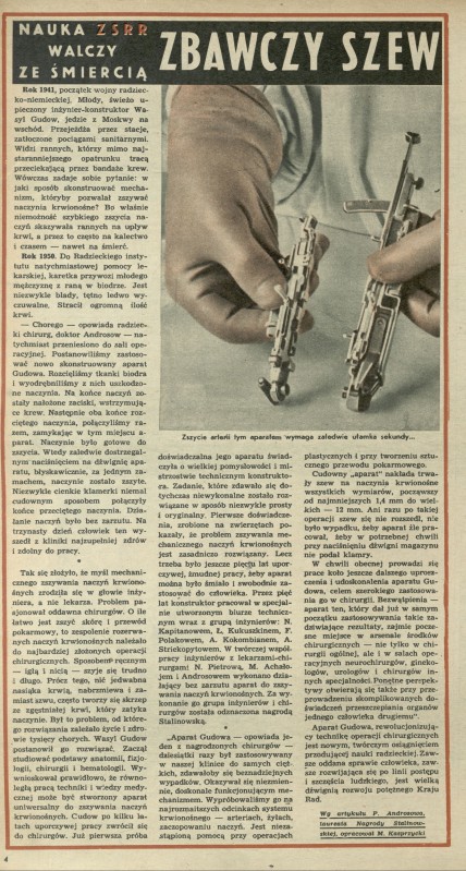 Archiwum / Nauka nr 336 (38/1951) 05/17 Podziel się Tytuł Zbawczy szew Autor Michał Kasprzycki Kategoria Nauka Artykuł z numeru 336 (38/1951) Data wydania 16 września 1951 Tagi medycyna Androsow operacja chirurgia apart Gudowa