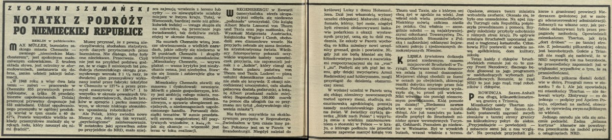Archiwum / Relacja nr 288 (42/1950) 15/18 Podziel się Tytuł Notatki z podróży po Niemieckiej Republice Autor Zygmunt Szymański Kategoria Relacja Artykuł z numeru 288 (42/1950) Data wydania 15 października 1950 Tagi Chemnitz Niemcy Regensberg Bruchstedt Saxen-Anhalt