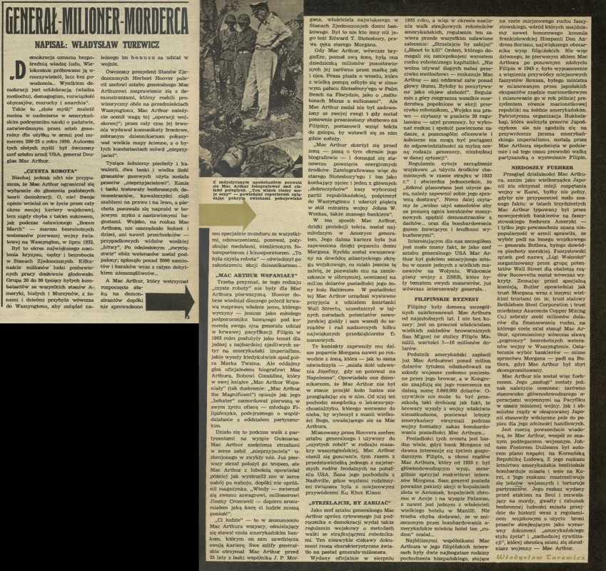 Archiwum / Artykuł nr 290 (44/1950) 15/162 Podziel się Tytuł Generał-milioner-morderca Autor Władysław Turewicz Kategoria Artykuł Artykuł z numeru 290 (44/1950) Data wydania 29 października 1950 Tagi Mac Arthur Herbert Hoover Józef Piłsudzki