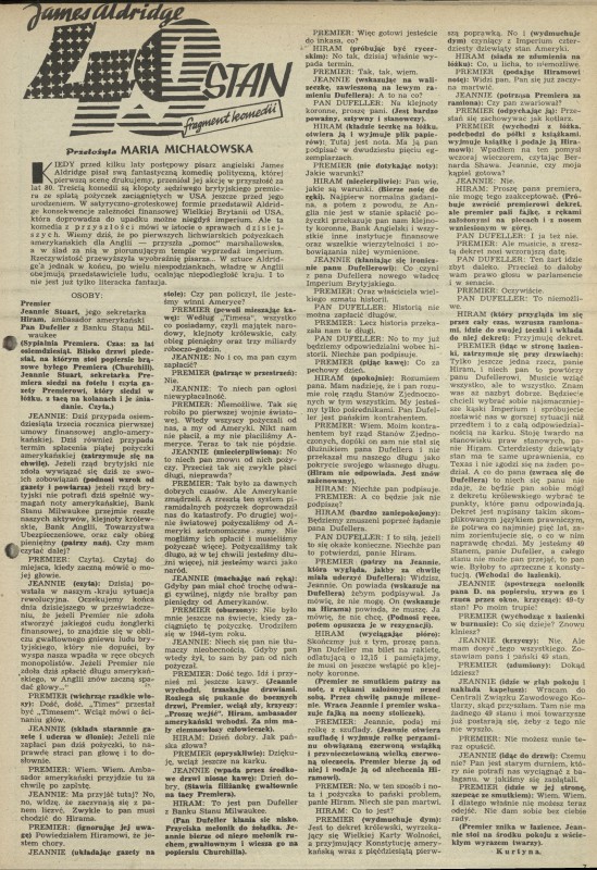 Archiwum / Proza nr 408 (05/1953) 02/21 Podziel się Tytuł 49 stan (fragment komedii) Autor James Alridge Maria Michałowska Kategoria Proza Artykuł z numeru 408 (5/1953) Data wydania 1 lutego 1953 Tagi literatura brytyjska komedia polityczna USA