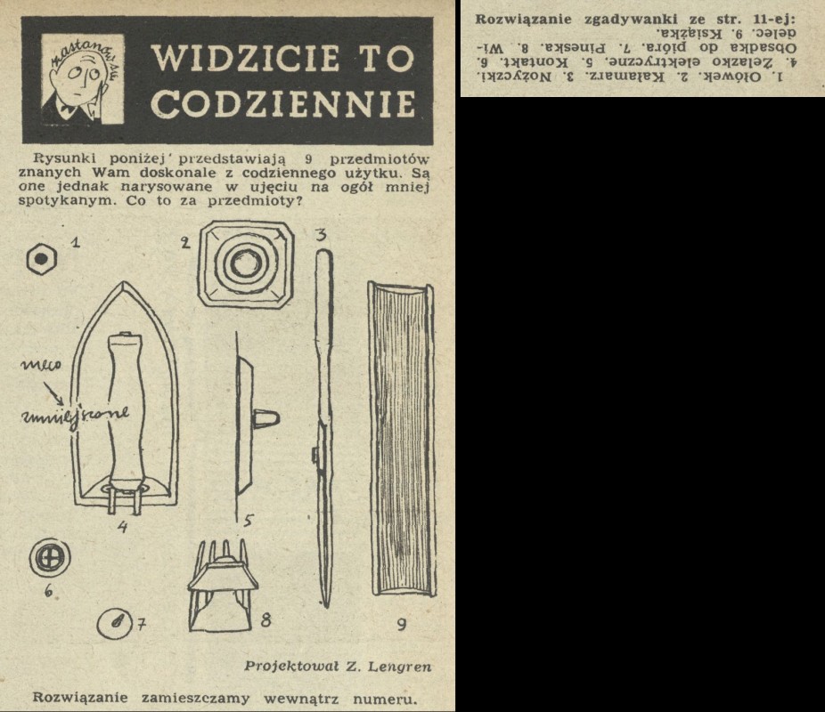 Archiwum / Zastanów się nr 408 (05/1953) 59/269 Podziel się Tytuł Widzicie to codziennie Autor Zbigniew Lengren Rubryka Zastanów się Artykuł z numeru 408 (5/1953) Data wydania 1 lutego 1953 Tagi zagadka