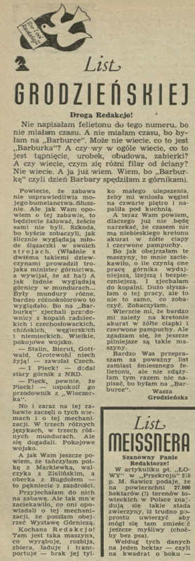 Archiwum / Listy do i od redakcji nr 297 (51/1950) 9497/123969 Podziel się Tytuł List Grodzieńskiej Autor Stefania Grodzieńska Rubryka Listy do i od redakcji Artykuł z numeru 297 (51/1950) Data wydania 17 grudnia 1950 Tagi Barbórka górnicy kopalnie
