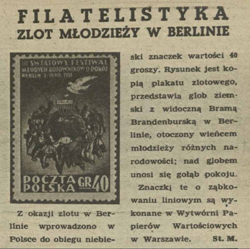 Archiwum / Filatelistyka nr 332 (34/1951) 13/39 Podziel się Tytuł Zlot młodzieży w berlinie Autor Stanisław Mikstein Rubryka Filatelistyka Artykuł z numeru 332 (34/1951) Data wydania 19 sierpnia 1951