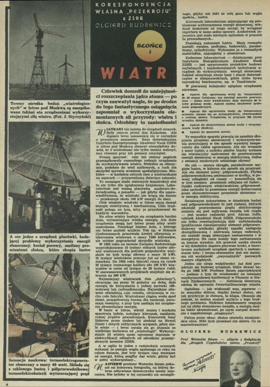 Archiwum / korespondencja własna "Przekroju" nr 584 (25/1956) 42/335 Podziel się Tytuł Słońce i wiatr Autor Olgierd Budrewicz Rubryka korespondencja własna "Przekroju" Artykuł z numeru 584 (25/1956) Data wydania 17 czerwca 1956 Tagi wiatraki energia wiatru energia słoneczna natura nauka Walentin Baum