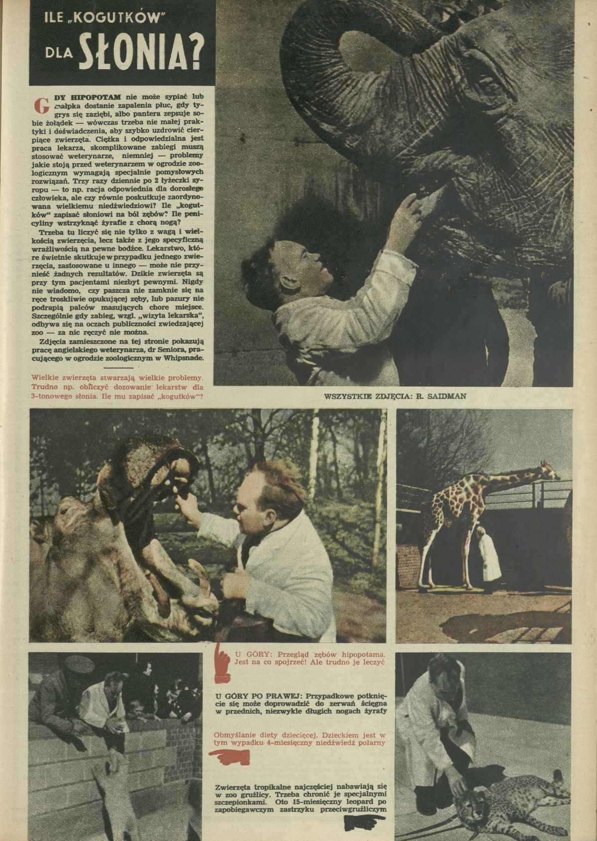 Archiwum / Fotoreportaż nr 584 (25/1956) 22632/123969 Podziel się Tytuł Ile „kogutków” dla słonia? Autor R. Saidman Kategoria Fotoreportaż Artykuł z numeru 584 (25/1956) Data wydania 17 czerwca 1956 Tagi zwierzęta fauna weterynarz dr Senior Zoo słoń hipopotam niedźwiedź polarny leopard