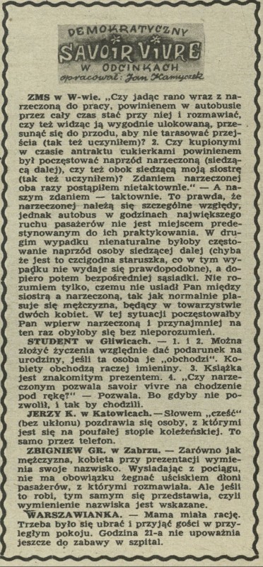 Archiwum / Demokratyczny savoir-vivre nr 339 (41/1951) 13/53 Podziel się Tytuł Demokratyczny savoir-vivre Autor Jan Kamyczek Rubryka Demokratyczny savoir-vivre Artykuł z numeru 339 (41/1951) Data wydania 7 października 1951