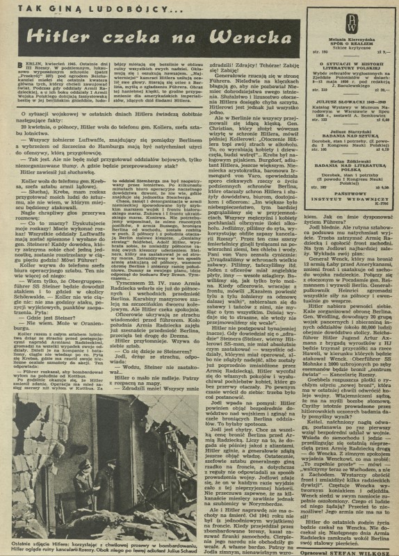 Archiwum / Artykuł nr 339 (41/1951) 18/68 Podziel się Tytuł Tak giną ludobójcy... Hitler czeka na Wencka Autor Stefan Wilkosz Kategoria Artykuł Artykuł z numeru 339 (41/1951) Data wydania 7 października 1951