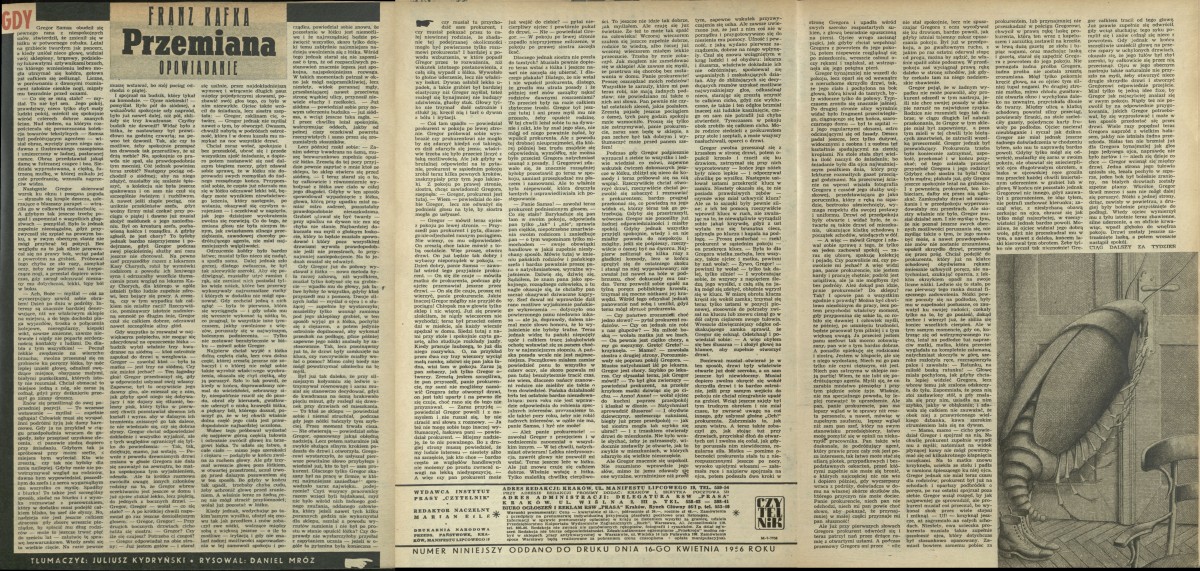 Archiwum / Opowiadanie nr 576 (17/1956) 14/42 Podziel się Tytuł Przemiana Autor Franz Kafka Juliusz Kydryński Kategoria Opowiadanie Artykuł z numeru 576 (17/1956) Data wydania 22 kwietnia 1956 Tagi literatura niemiecka Daniel Mróz
