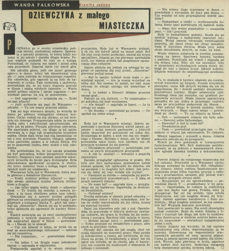 Archiwum / Kronika sądowa nr 1297 (07/1970) 53121/123969 Podziel się Tytuł Dziewczynka z małego miasteczka Autor Wanda Falkowska Rubryka Kronika sądowa Artykuł z numeru 1297 (7/1970) Data wydania 15 lutego 1970