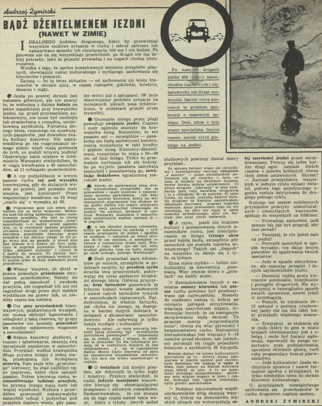 Archiwum / Społeczeństwo nr 1297 (07/1970) 03/135 Podziel się Tytuł Bądź dżentelmenem jezdni (nawet w zimie) Autor Andrzej Żymirski Kategoria Społeczeństwo Artykuł z numeru 1297 (7/1970) Data wydania 15 lutego 1970 Tagi samochody motoryzacja