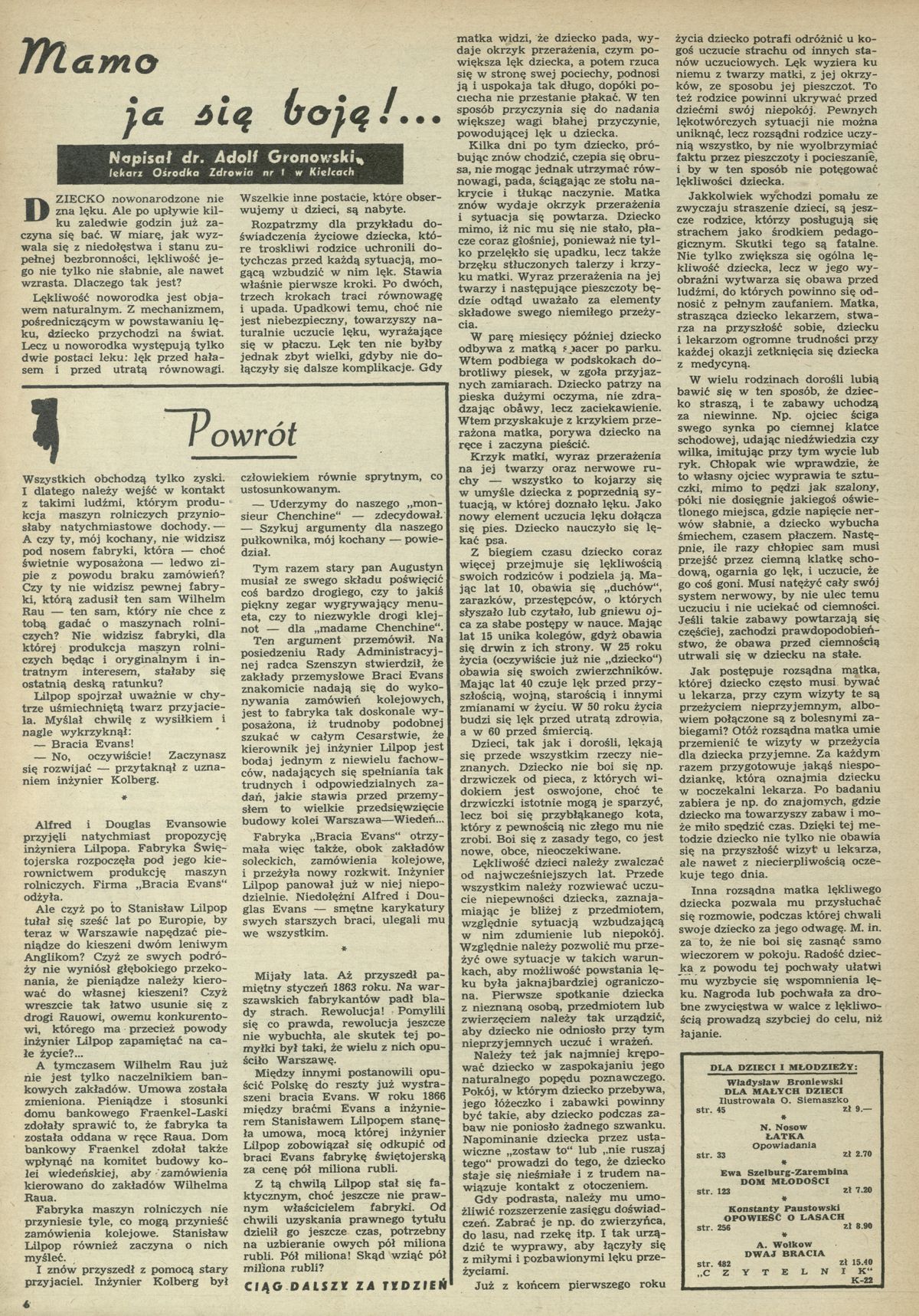 Archiwum / Nauka nr 354 (03/1952) 21/45 Podziel się Tytuł Mamo, ja się boję!... Autor Adolf Gronowski Kategoria Nauka Artykuł z numeru 354 (3/1952) Data wydania 20 stycznia 1952 Tagi służba zdrowia dzieci medycyna