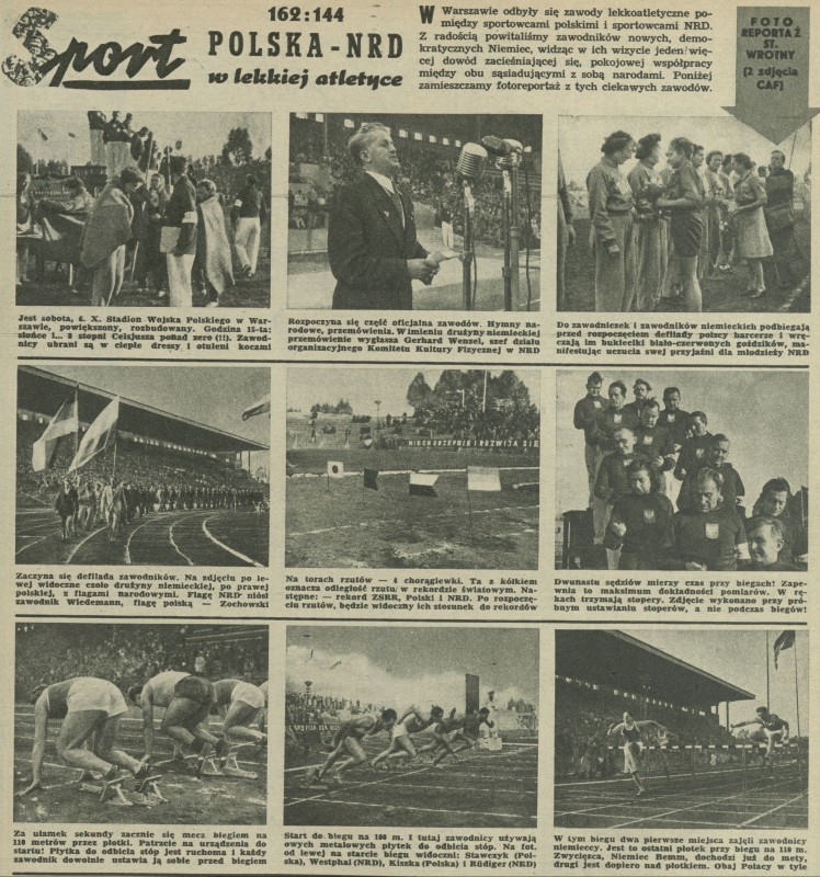 Archiwum / Sport nr 340 (42/1951) 11303/123969 Podziel się Tytuł Polska-NRD w lekkiej atletyce Autor Stanisław Wrotny Rubryka Sport Artykuł z numeru 340 (42/1951) Data wydania 14 października 1951