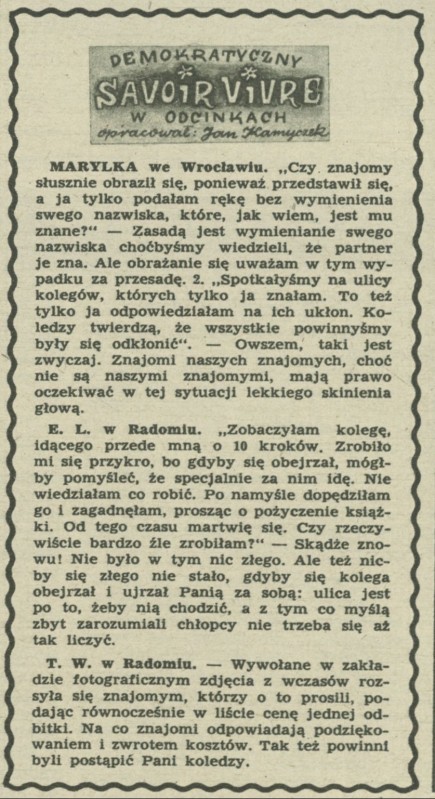 Archiwum / Demokratyczny savoir-vivre nr 347 (49/1951) 100/493 Podziel się Tytuł Demokratyczny savoir-vivre Autor Jan Kamyczek Rubryka Demokratyczny savoir-vivre Artykuł z numeru 347 (49/1951) Data wydania 2 grudnia 1951 Tagi obyczaje kultura