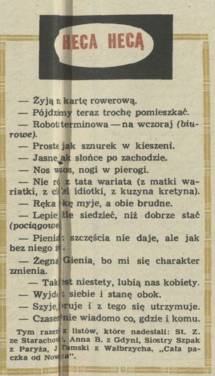 Archiwum / Heca hecą nr 1298 (08/1970) 53158/123969 Podziel się Tytuł Heca hecą Rubryka Heca hecą Artykuł z numeru 1298 (8/1970) Data wydania 22 lutego 1970 Tagi powiedzenia powiedzonka
