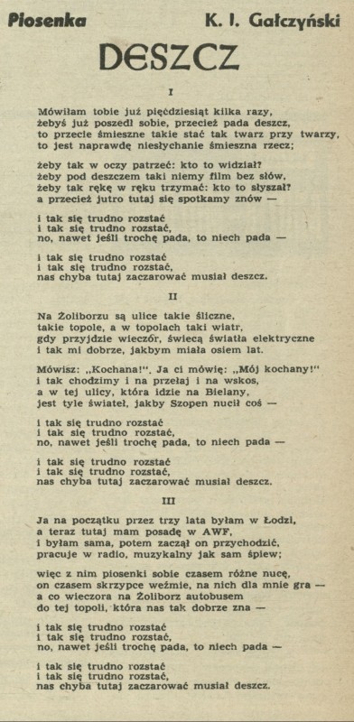Archiwum / Poezja nr 354 (03/1952) 104/2505 Podziel się Tytuł Piosenka – Deszcz Autor Konstanty Ildefons Gałczyński Kategoria Poezja Artykuł z numeru 354 (3/1952) Data wydania 20 stycznia 1952 Tagi Warszawa Żoliborz miłość