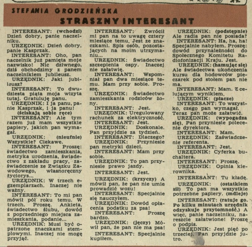 Archiwum / Rozmaitości [old] nr 354 (03/1952) 107/2505 Podziel się Tytuł Straszny interesant Autor Stefania Grodzieńska Rubryka Rozmaitości [old] Artykuł z numeru 354 (3/1952) Data wydania 20 stycznia 1952 Tagi biurokracja urzędnicy