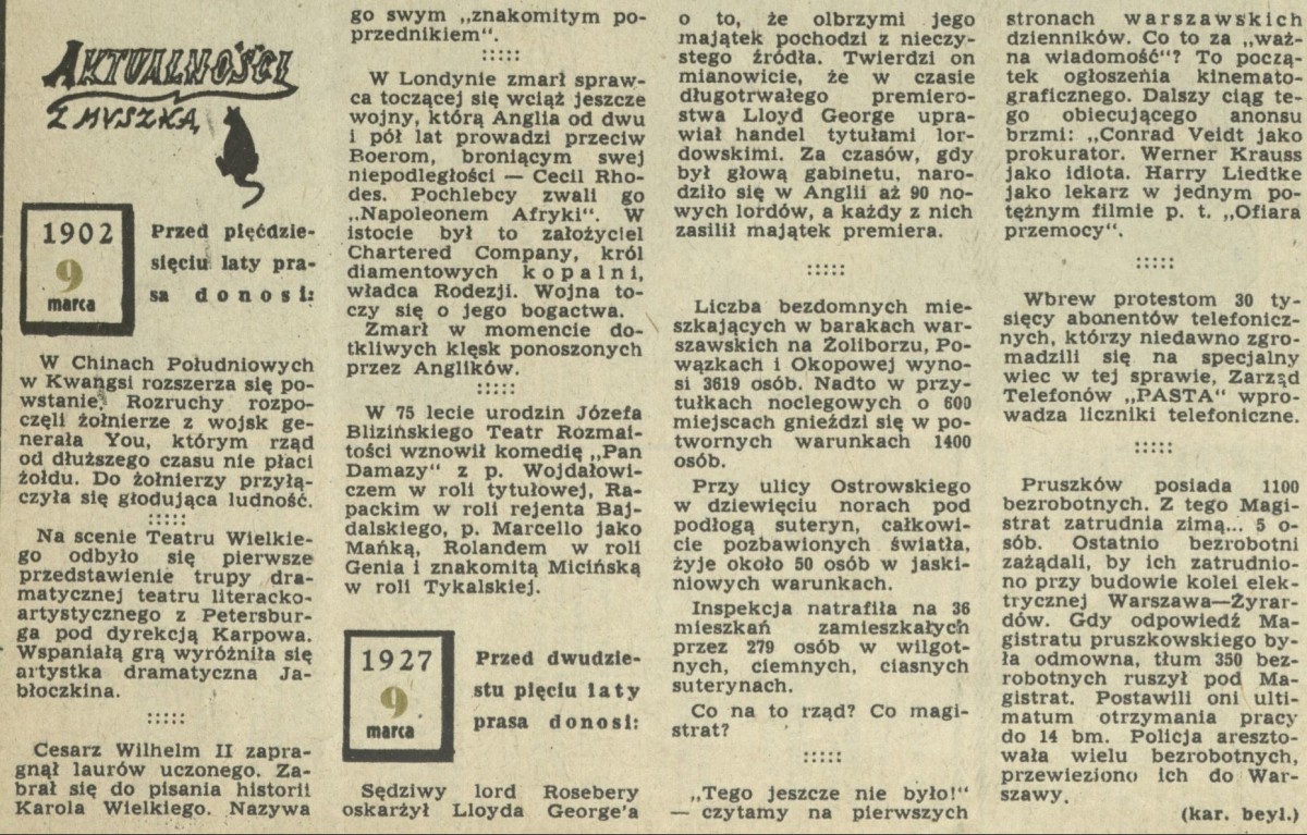 Archiwum / Aktualności z myszką nr 361 (10/1952) 12210/123969 Podziel się Tytuł Aktualności z myszką Rubryka Aktualności z myszką Artykuł z numeru 361 (10/1952) Data wydania 9 marca 1952 Tagi Chiny Wilhelm II Żoliborz Warszawa bezdomność Teatr Rozmaitości