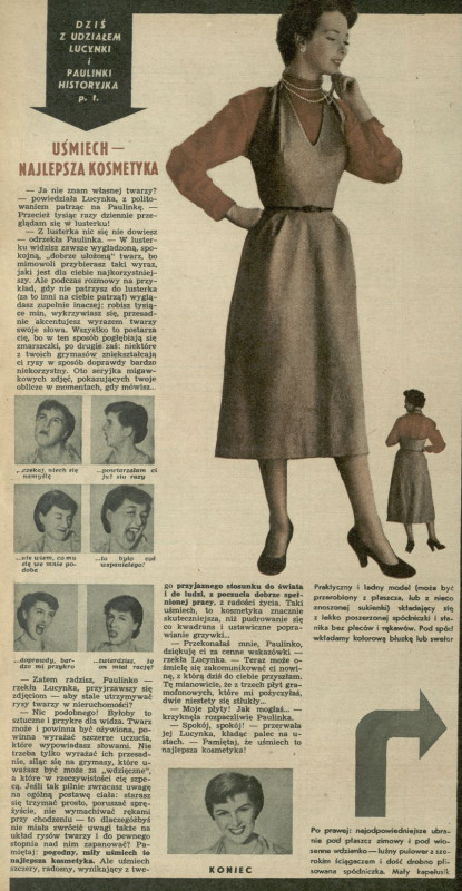 Archiwum / Dziś Lucynka i Paulinka nr 357 (06/1952) 03/21 Podziel się Tytuł Uśmiech – najlepsza kosmetyka Rubryka Dziś Lucynka i Paulinka Artykuł z numeru 357 (6/1952) Data wydania 10 lutego 1952 Tagi porady urodowe uśmiech
