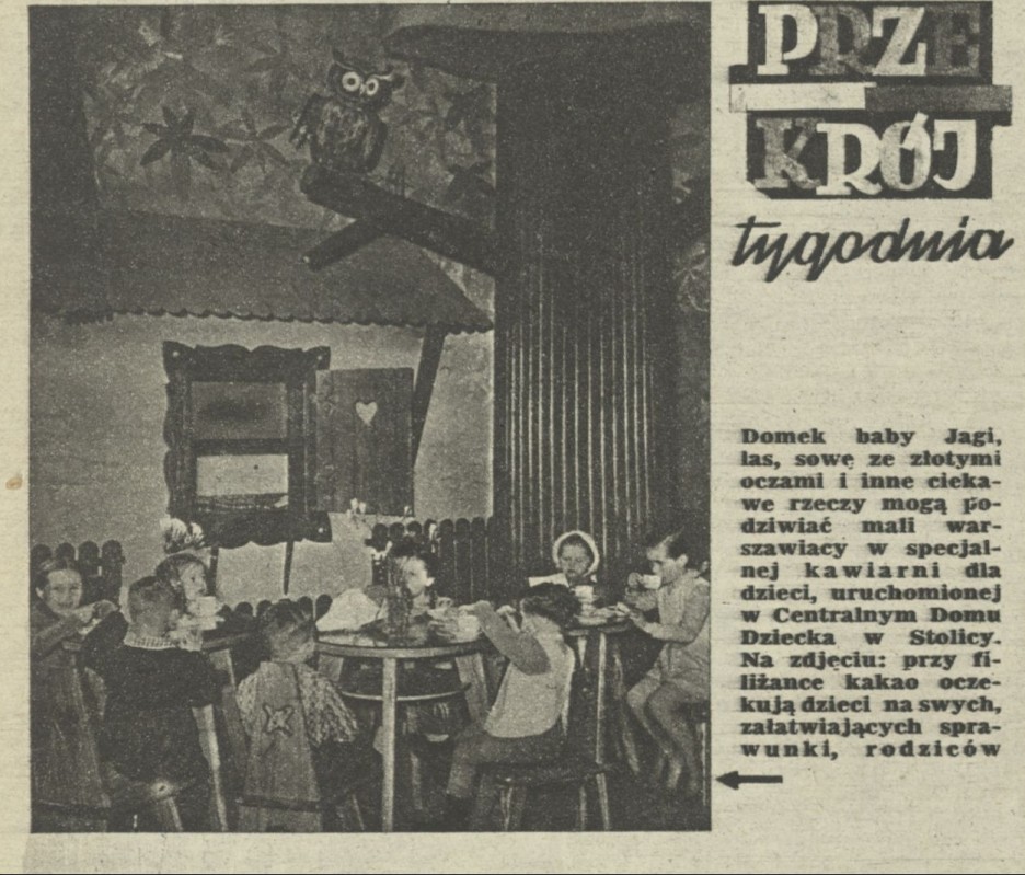 Archiwum / Przekrój tygodnia nr 363 (12/1952) 423/3219 Podziel się Tytuł Kawiarnia w Centralnym Domu Dziecka w Warszawie Autor CAF Rubryka Przekrój tygodnia Artykuł z numeru 363 (12/1952) Data wydania 23 marca 1952 Tagi baba Jaga Stolica