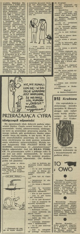 Archiwum / Różności nr 375 (24/1952) 1/7 Podziel się Tytuł Przerażająca cyfra idiotycznych odpowiedzi Autor Bolesław Żabko-Potopowicz Kategoria Różności Artykuł z numeru 375 (24/1952) Data wydania 15 czerwca 1952 Tagi groteska pomyłki