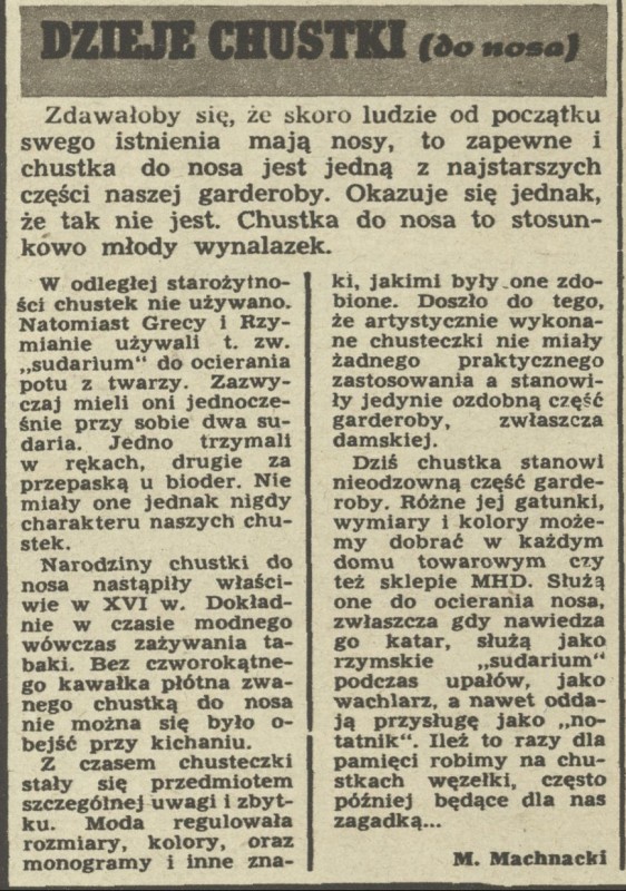 Archiwum / Różności nr 380 (29/1952) 03/20 Podziel się Tytuł Dzieje chustki (do nosa) Autor Marek Machnacki Kategoria Różności Artykuł z numeru 380 (29/1952) Data wydania 20 lipca 1952