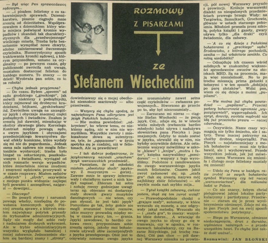 Archiwum / Rozmowy z artystami nr 488 (33/1954) 892/942 Podziel się Tytuł Rozmowy z pisarzami - ze Stefanem Wiecheckim Autor Jan Błoński Rubryka Rozmowy z artystami Artykuł z numeru 488 (33/1954) Data wydania 15 sierpnia 1954 Tagi Wiech