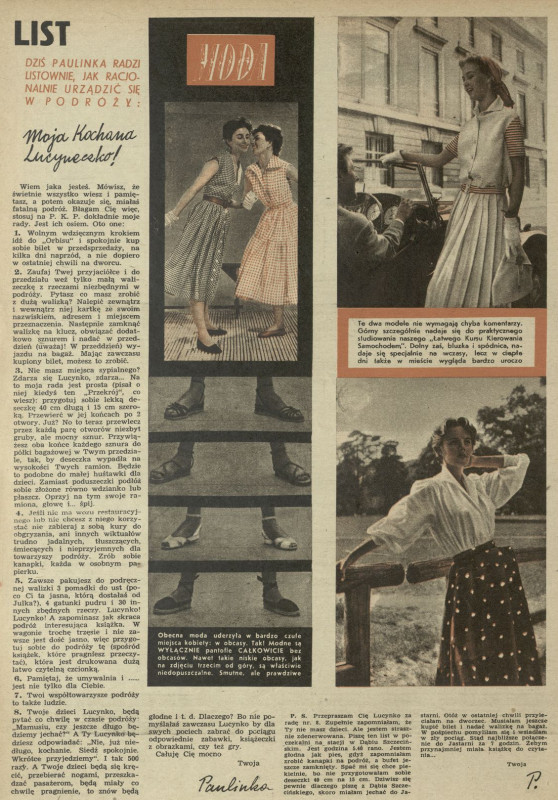 Archiwum / Dziś Lucynka i Paulinka nr 385 (34/1952) 78/744 Podziel się Tytuł List – jak racjonalnie urządzić się w podróży Autor Lucynka i Paulinka Rubryka Dziś Lucynka i Paulinka Artykuł z numeru 385 (34/1952) Data wydania 24 sierpnia 1952 Tagi bagaż pakowanie moda