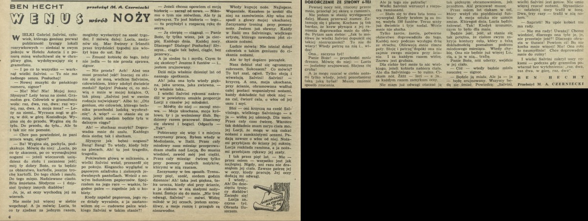 Archiwum / Opowiadanie nr 531 (24/1955) 224/470 Podziel się Tytuł Wenus wśród noży Autor Ben Hecht Marian Andrzej Czerniecki Kategoria Opowiadanie Artykuł z numeru 531 (24/1955) Data wydania 12 czerwca 1955