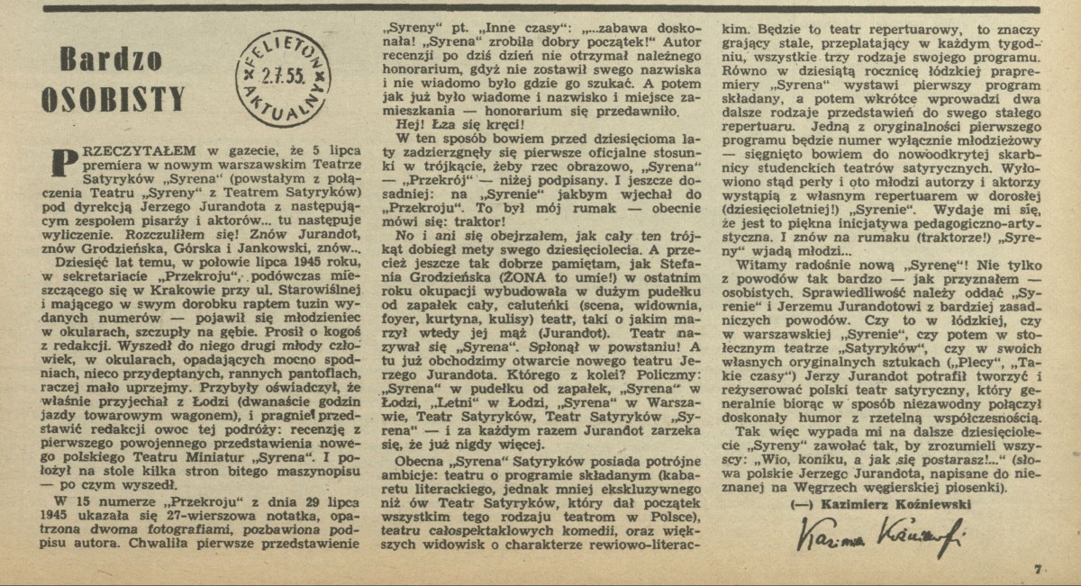 Archiwum / Teatr nr 534 (27/1955) 19/39 Podziel się Tytuł Bardzo osobisty Autor Kazimierz Koźniewski Rubryka Teatr Artykuł z numeru 534 (27/1955) Data wydania 3 lipca 1955 Tagi Teatr satyryków "Syrena" Kraków
