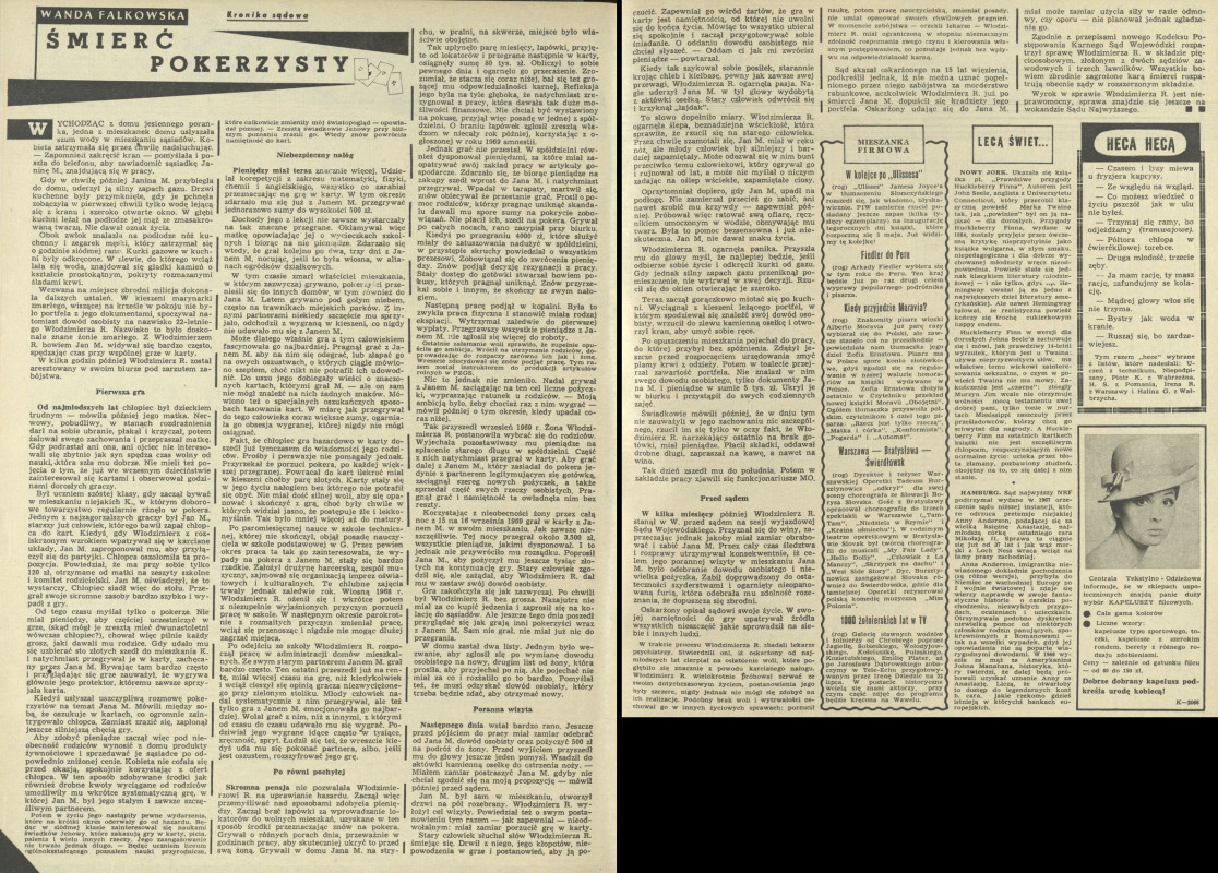 Archiwum / Kronika sądowa nr 1304 (14/1970) 12/348 Podziel się Tytuł Śmierć pokerzysty Autor Wanda Falkowska Rubryka Kronika sądowa Artykuł z numeru 1304 (14/1970) Data wydania 5 kwietnia 1970