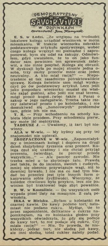 Archiwum / Demokratyczny savoir-vivre nr 546 (39/1955) 38/54 Podziel się Tytuł Demokratyczny savoir-vivre Autor Jan Kamyczek Rubryka Demokratyczny savoir-vivre Artykuł z numeru 546 (39/1955) Data wydania 25 września 1955 Tagi obyczaje kultura