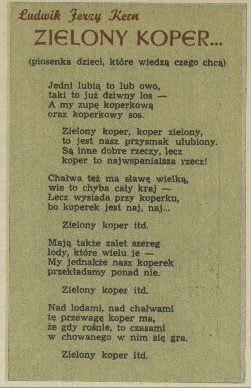 Archiwum / Rozmaitości [old] nr 551 (44/1955) 54/68 Podziel się Tytuł Zielony koper... Autor Ludwik Jerzy Kern Rubryka Rozmaitości [old] Artykuł z numeru 551 (44/1955) Data wydania 30 października 1955