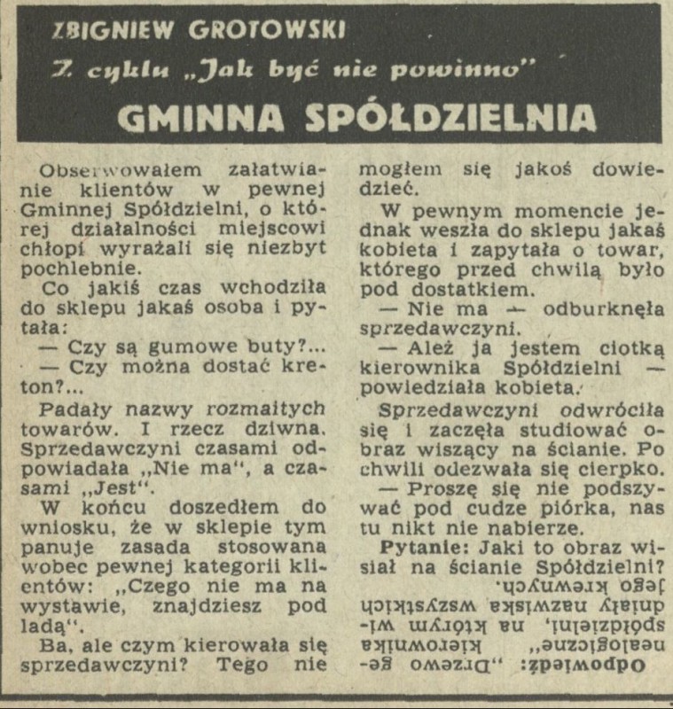 Archiwum / Zgadywanki Przekroju nr 383 (32/1952) 13256/123969 Podziel się Tytuł Z cyklu: „Jak być nie powinno” - Gminna spółdzielnia Autor Zbigniew Grotowski Rubryka Zgadywanki Przekroju Artykuł z numeru 383 (32/1952) Data wydania 10 sierpnia 1952 Tagi zagadka