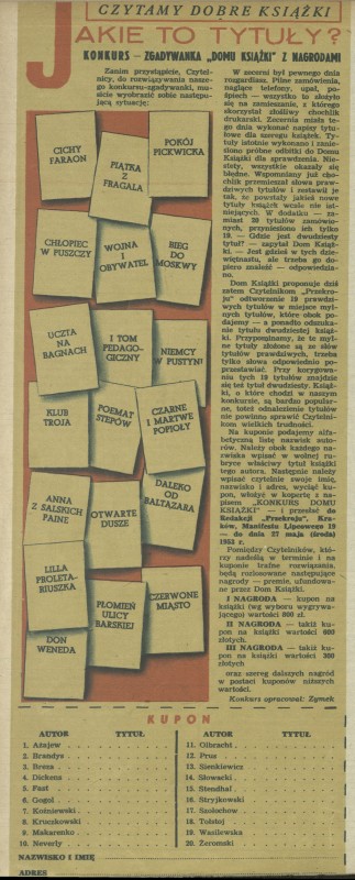 Archiwum / Konkurs nr 423 (20/1953) 09/21 Podziel się Tytuł Konkurs - zgadywanka „Domu Książki”. Czytamy dobre książki. Jakie to tytuły? Autor Zymek Rubryka Konkurs Artykuł z numeru 423 (20/1953) Data wydania 14 maja 1953 Tagi literatura