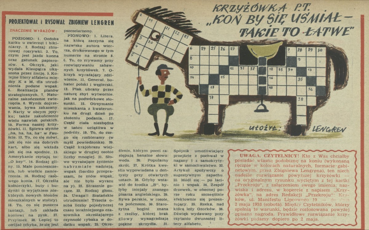 Archiwum / Krzyżówka nr 420 (17/1953) 37/49 Podziel się Tytuł Krzyżówka p.t. „Koń by się uśmiał - takie to łatwe” Autor Zbigniew Lengren Rubryka Krzyżówka Artykuł z numeru 420 (17/1953) Data wydania 20 kwietnia 1953