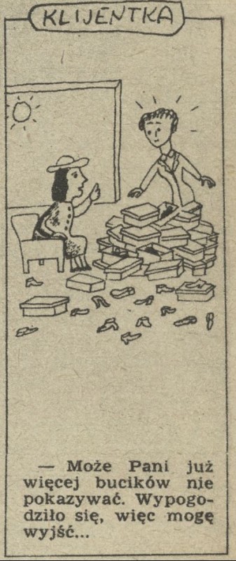 Archiwum / Historyjki obrazkowe nr 410 (07/1953) 12006/123969 Podziel się Tytuł Klientka Autor Marian Eile Kategoria Historyjki obrazkowe Artykuł z numeru 410 (7/1953) Data wydania 15 lutego 1952 Tagi żart rysunkowy buty sklep
