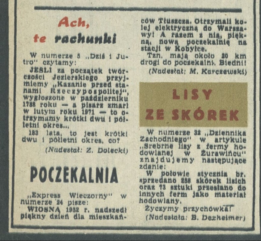Archiwum / Rozmaitości [old] nr 411 (08/1953) 14567/123969 Podziel się Tytuł Ach, te rachunki / Poczekalnia / Lisy ze skórek Rubryka Rozmaitości [old] Artykuł z numeru 411 (8/1953) Data wydania 22 lutego 1953